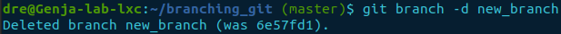 If you have more than one branch to delete, just enter them in series. But beware, you can’t have the branch you wish to delete checked out. So we’ll switch back to the master.